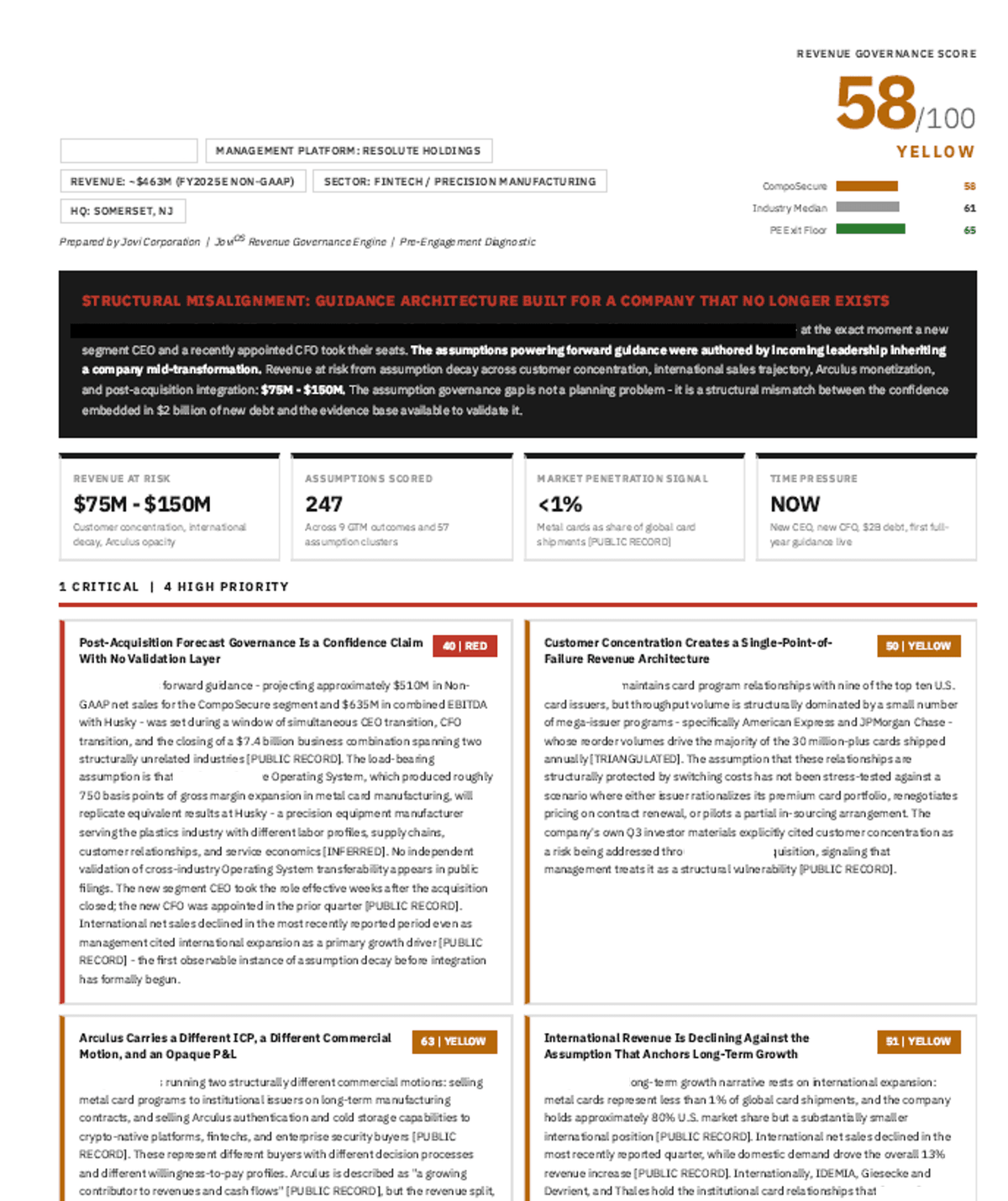 We run every portco through 250+ scored assumptions across 12 revenue outcomes. You get a diagnostic that shows exactly where the thesis is holding and where it is breaking down.
